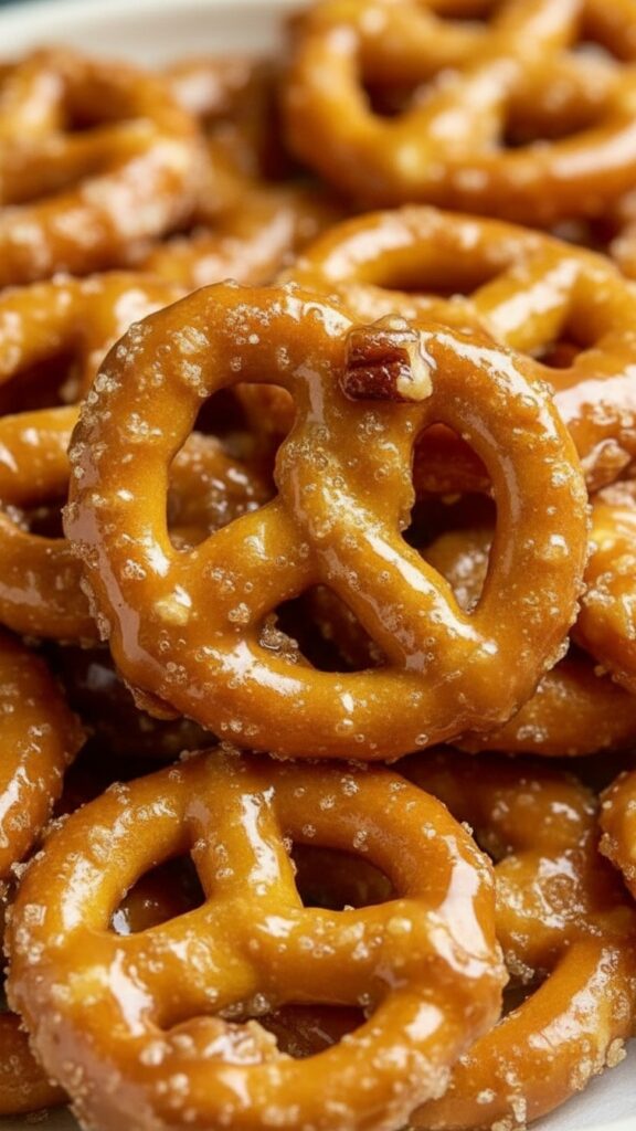 - Bake for 1 hour, stirring every 15 minutes to ensure the hot toffee mixture evenly coats the pretzels. Once baked, spread the pretzel mixture onto a wax paper-lined countertop and immediately sprinkle with the remaining toffee bits. Allow the pretzels to set and harden, about 1 hour, before breaking into smaller clusters and packaging.