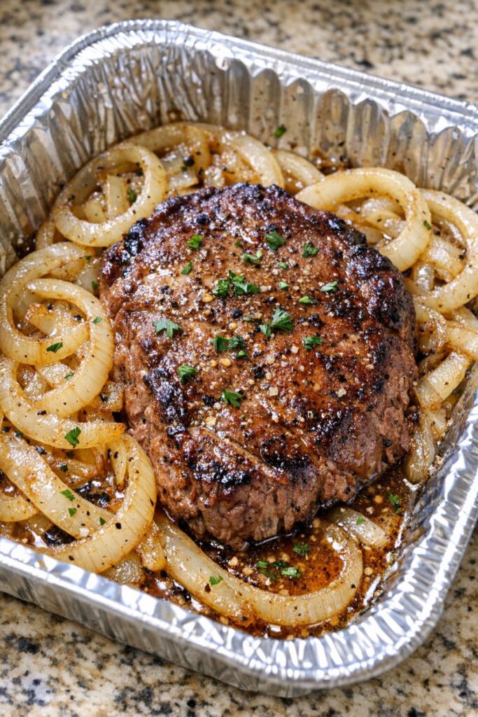 - Serve: Carefully remove the baking sheet from the oven and let the packets rest for 5 minutes. Use caution when opening them—the steam will be hot. Open each packet, spoon the soft onions and juices over the steak, and serve directly from the foil or transfer to plates.